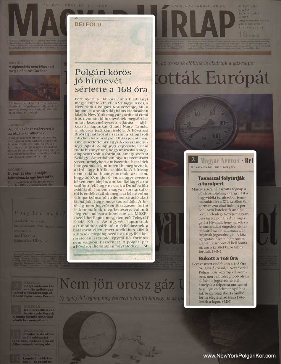 Pert nyert első fokon a 168 óra című kiadványt megjelentető kft. ellen Szilágyi Ákos, a New York-i Polgári Kör vezetője /2009.jan.6/