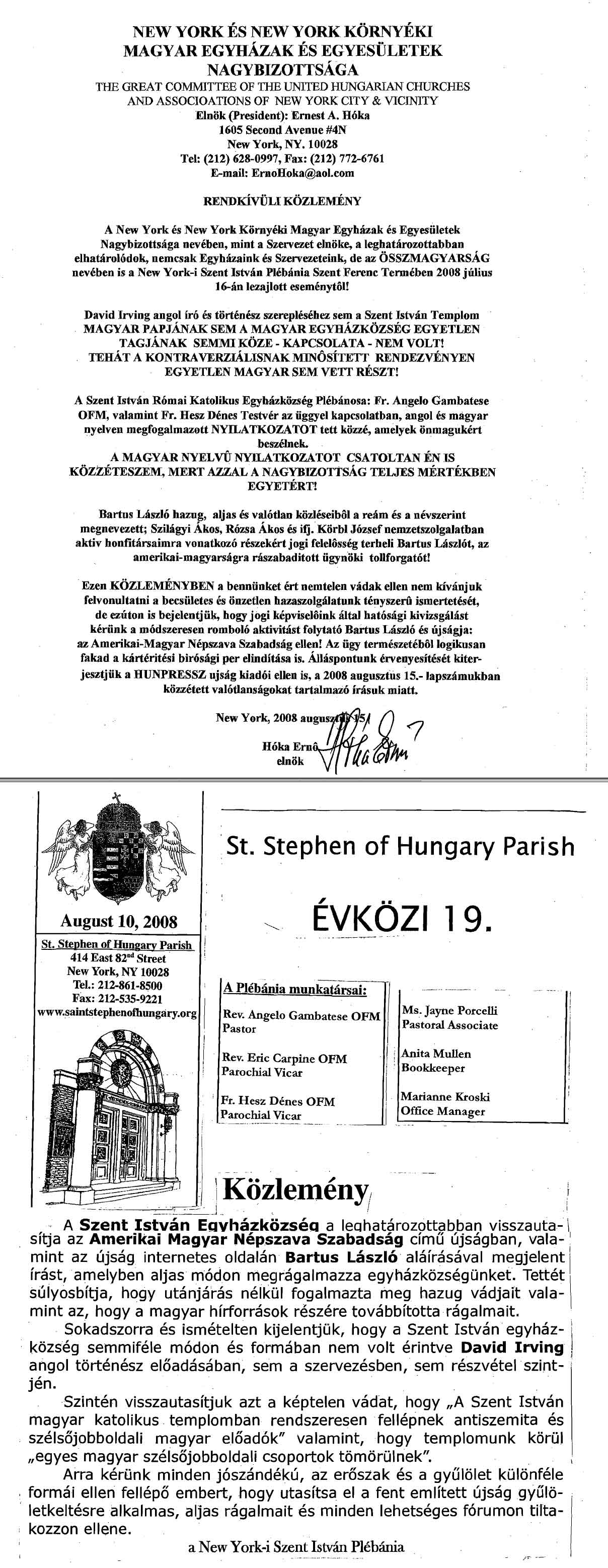 A közleményben az atyaelhatárolódott attól a múlt heti rendezvénytől, amelyen David Irvinget, a hírhedt holokauszttagadót látta vendégül a New York-i magyarok egy szélsőséges csoportja a magyar katolikus templomban. A csoport gyakran használja a Szent István templom helységeit rendezvényei megtartására. A templom vezetői azt állítják, hogy megtévesztették őket.