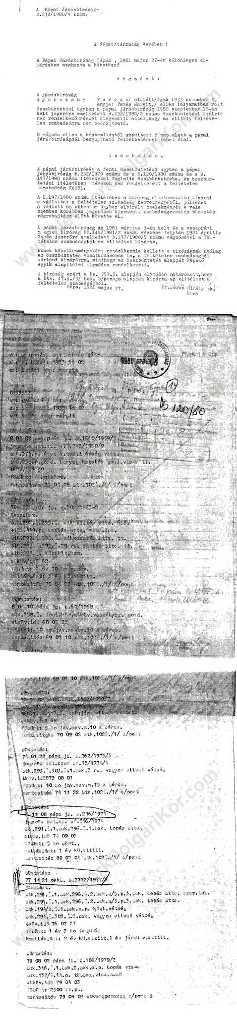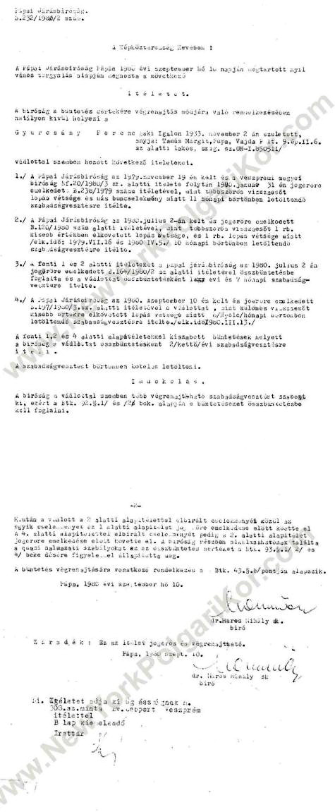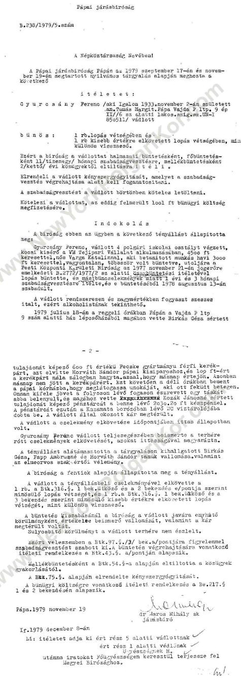 Gyurcsány Ferenc kormányfő édesapja több alkalommal is ült börtönben lopásért . Az alábbi iratok tanúsága szerint idősebb Gyurcsány Ferencet 1979. november 19-én a Pápai Járásbíróság mint különös visszaesőt egyrendbeli lopásért és egyrendbeli kisebb értékre elkövetett lopásért 11 hónapi szabadságvesztésre ítélte, és két évre eltiltotta a közügyektől. (ez fog történni fiával is, csak éppen nem két éves távlatról lesz szó - a szerk.). A Kuruc.info emlékeztet: egy vagy két évvel ezelőtt a köztörvényes miniszterelnök egyik, tizenéves csemetéjét is lopáson kapták egy budapesti áruházban.