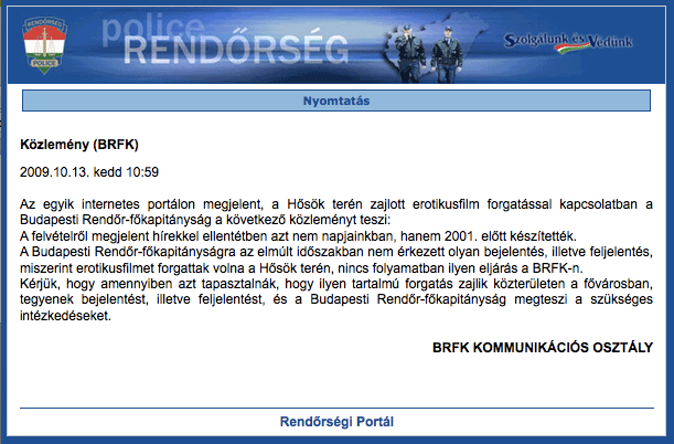 Azt irják: A Budapesti Rendőr-főkapitányságra az elmúlt időszakban nem érkezett olyan bejelentés, illetve feljelentés, miszerint erotikusfilmet forgattak volna a Hősök terén, nincs folyamatban ilyen eljárás a BRFK-n.